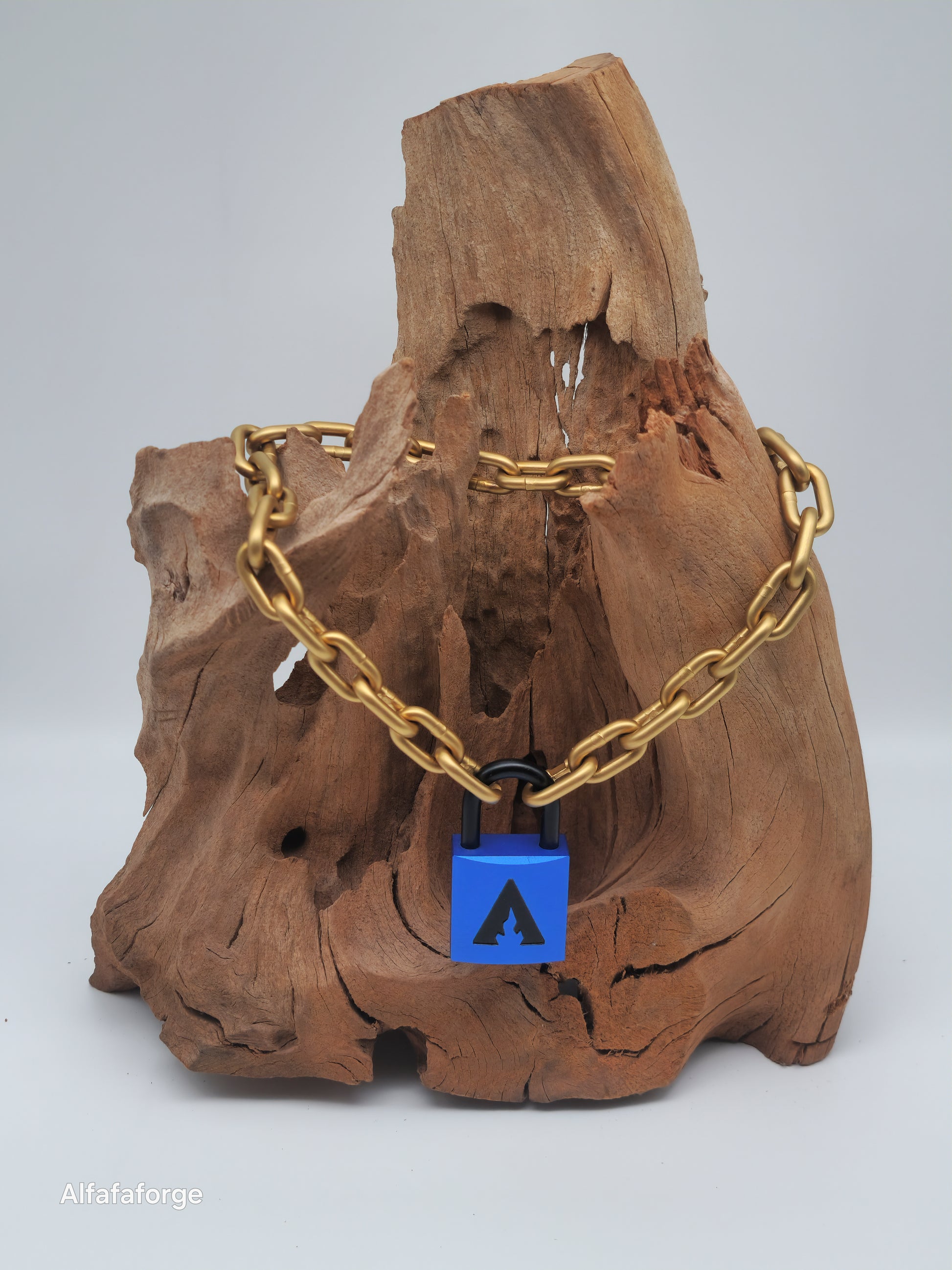 Mit der Alfa-Kollektion hast Du Dich für unser charakteristisches Markenlogo entschieden, das ein einfaches, aber markantes Design mit geraden Kanten aufweist. Diese Version hat ein schwarzes Logo auf einem Safiblauem Vorhängeschloss.