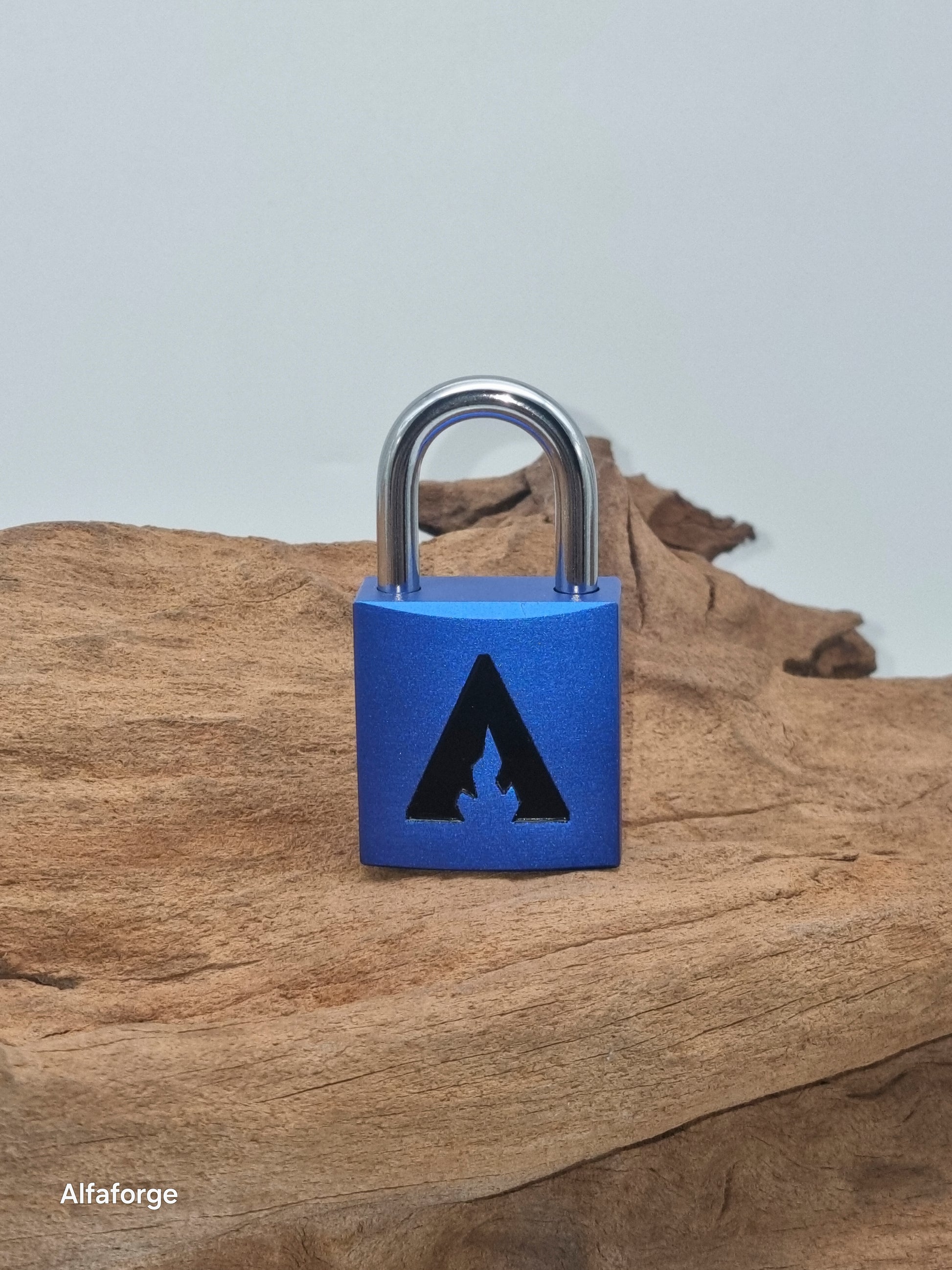 Mit der Alfa-Kollektion hast Du Dich für unser charakteristisches Markenlogo entschieden, das ein einfaches, aber markantes Design mit geraden Kanten aufweist. Diese Version hat ein schwarzes Logo auf einem Safiblauem Vorhängeschloss.