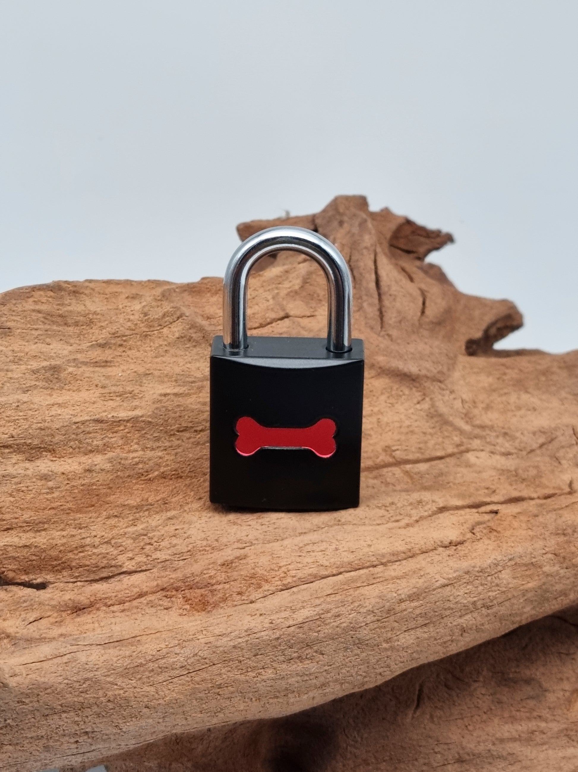 Unsere Guardian-Kollektion präsentiert einen Hundeknochen. Diese Version hat einen Infernoroten Hundeknochen auf einem schwarzen Vorhängeschloss.