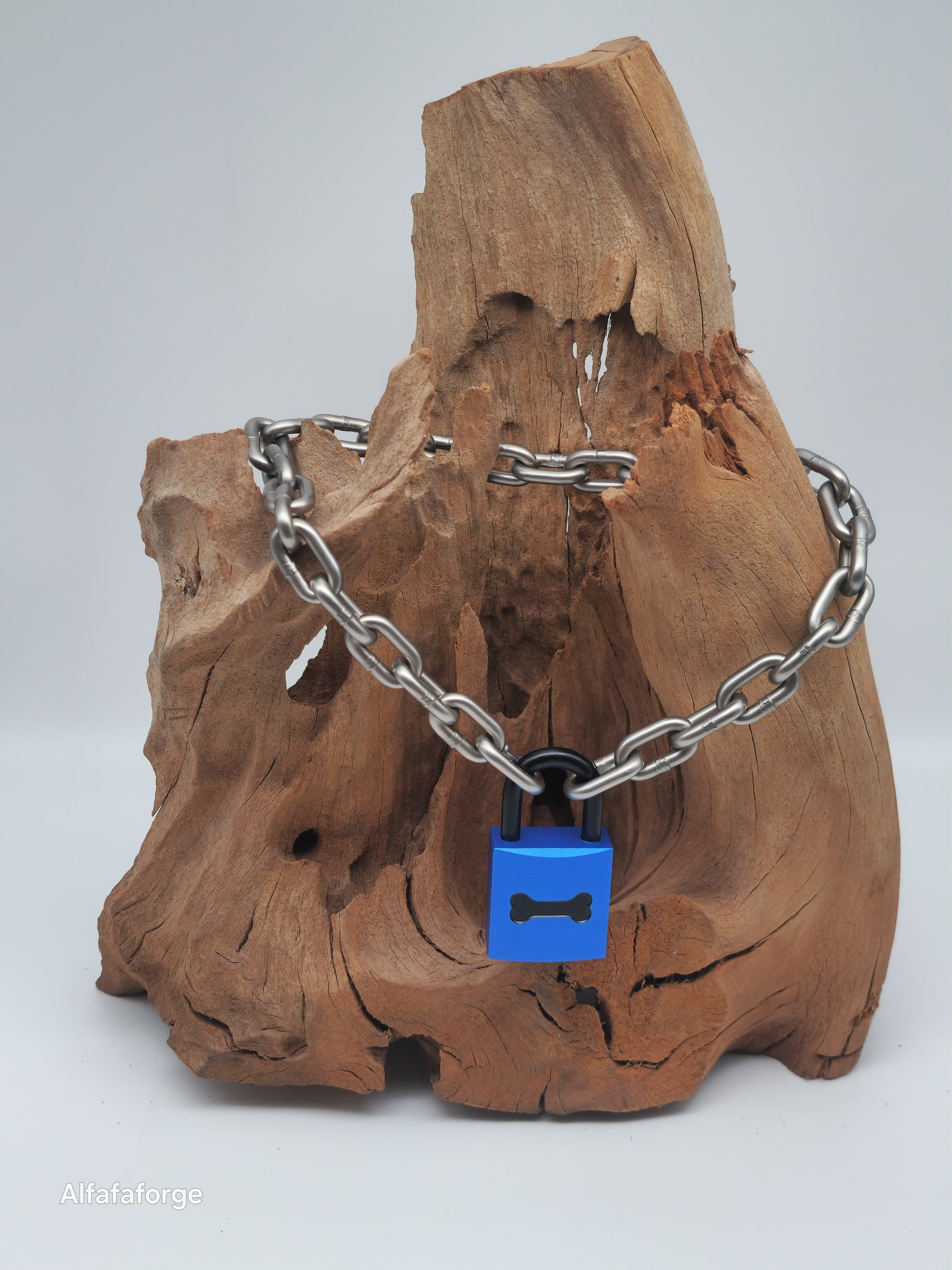 Unsere Guardian-Kollektion präsentiert einen Hundeknochen. Diese Version hat einen schwarzen Hundeknochen auf einem Safirblauem Vorhängeschloss.