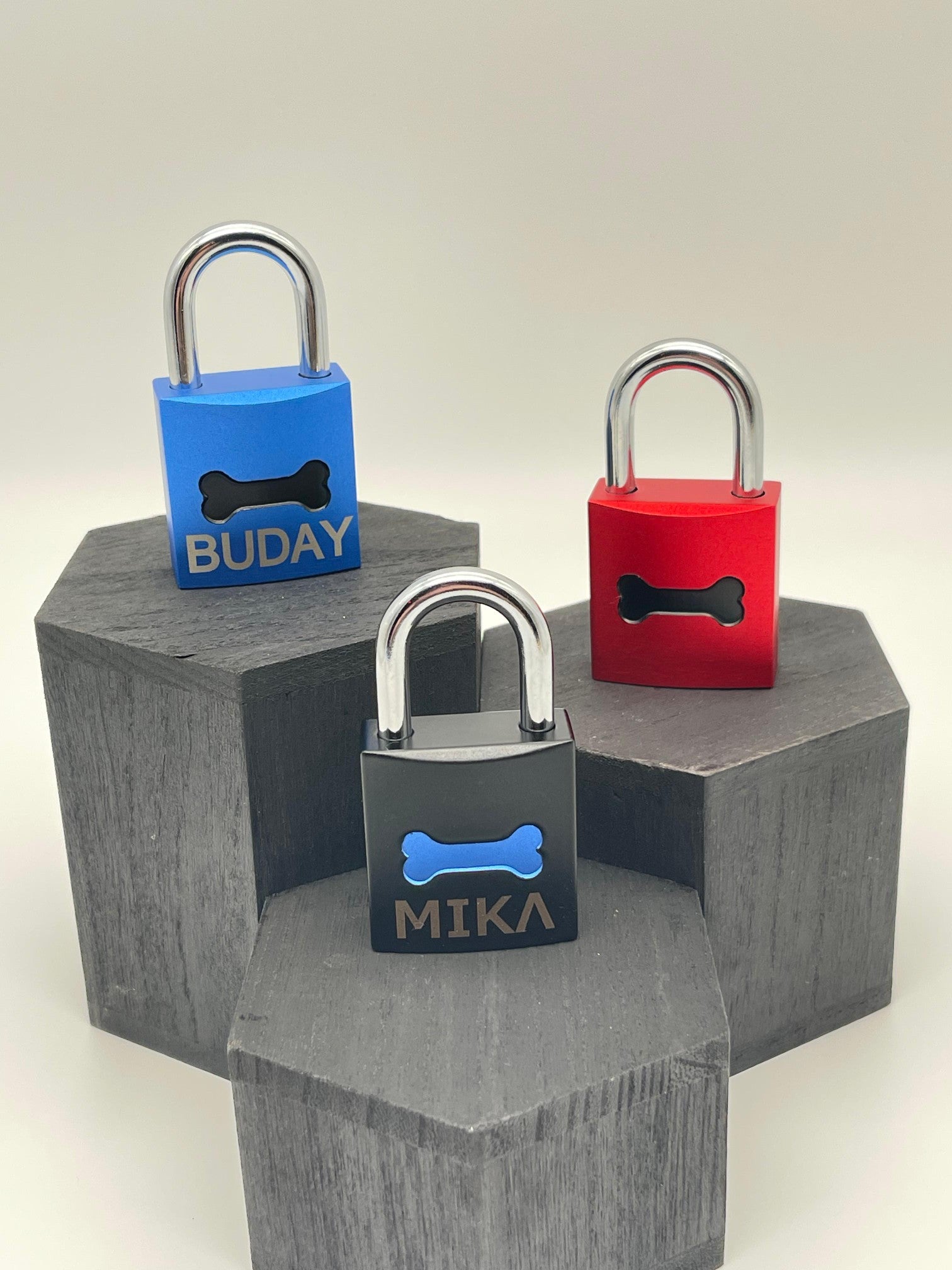 Unsere Guardian-Kollektion präsentiert einen Hundeknochen. Diese Version hat einen schwarzen Hundeknochen auf einem Safirblauem Vorhängeschloss.