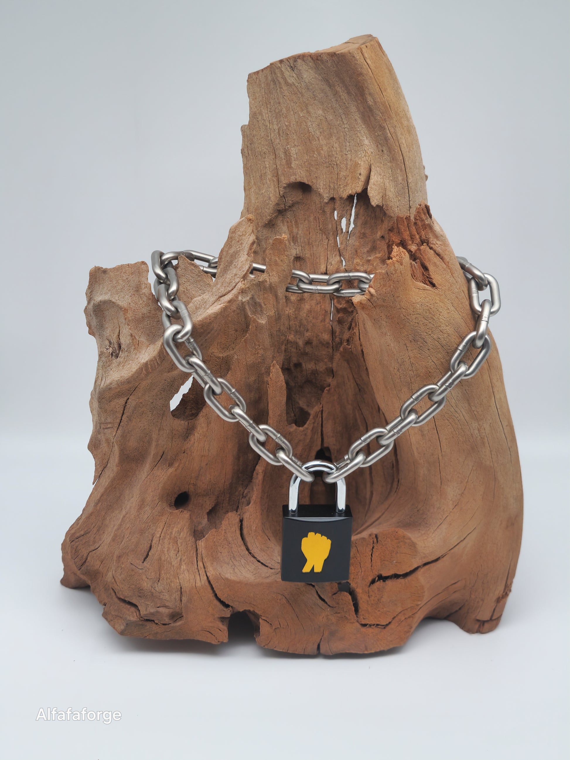 Mit der Titan-Kollektion setzt du ein kraftvolles Statement, das Aufmerksamkeit fordert. Diese Version zeigt eine Faust mit einer Flare-gelben Farbe auf einem schwarzen Vorhängeschloss.