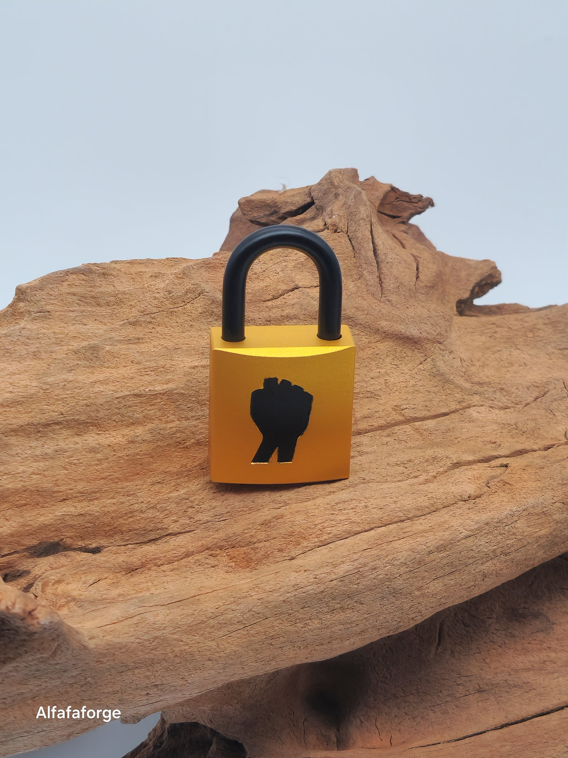 Die Titan-Kollektion setzt ein kraftvolles Statement, das Aufmerksamkeit erregt. Diese Version zeigt eine schwarze Faust auf einem Flare-gelben Vorhängeschloss.