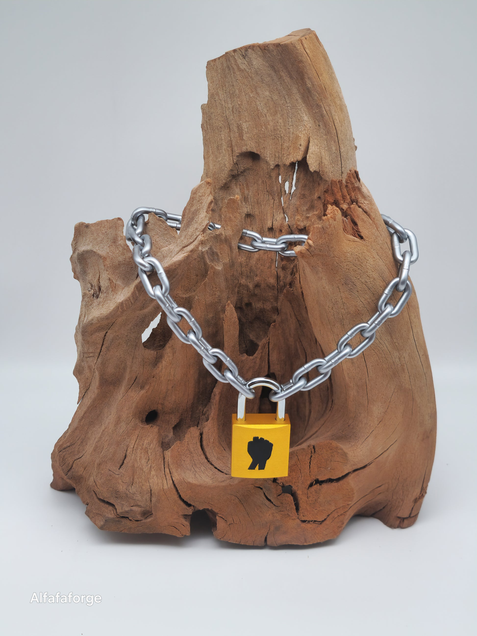 Die Titan-Kollektion setzt ein kraftvolles Statement, das Aufmerksamkeit erregt. Diese Version zeigt eine schwarze Faust auf einem Flare-gelben Vorhängeschloss.