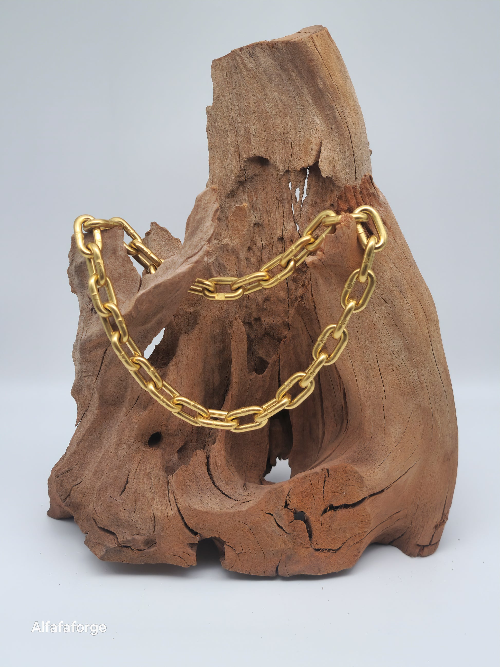 Keine Lust auf ein Vorhängeschloss? Diese Kette verfügt über einen nahtlosen, ineinandergreifenden Verschlussmechanismus, wie alle unsere Produkte. Die hochwertige Edelstahlkette ist in 3 Größen erhältlich, und diese Version kommt in unserer matten goldenen Sahara-Farbe.